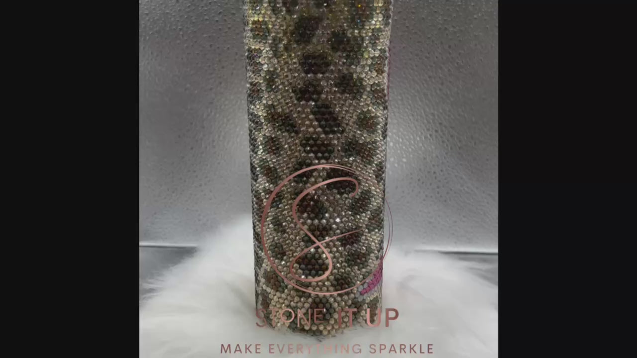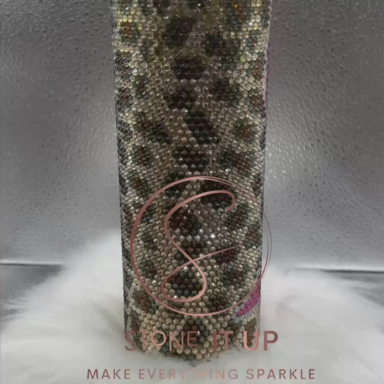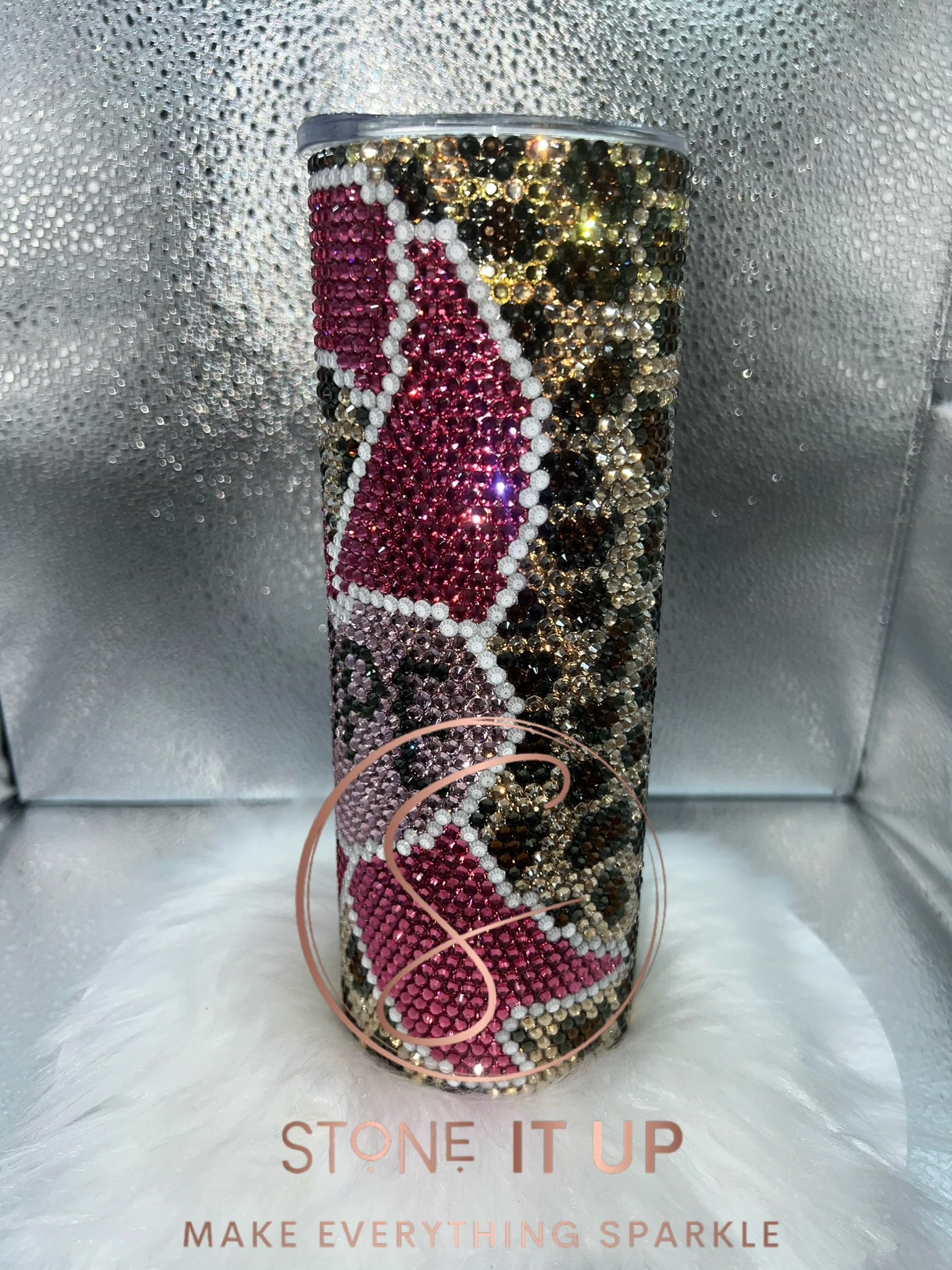 This 20oz tumbler features a striking cheetah print breast cancer ribbon design made from high-quality glass rhinestones, meticulously applied by hand using Liquid Fusion for lasting detail.