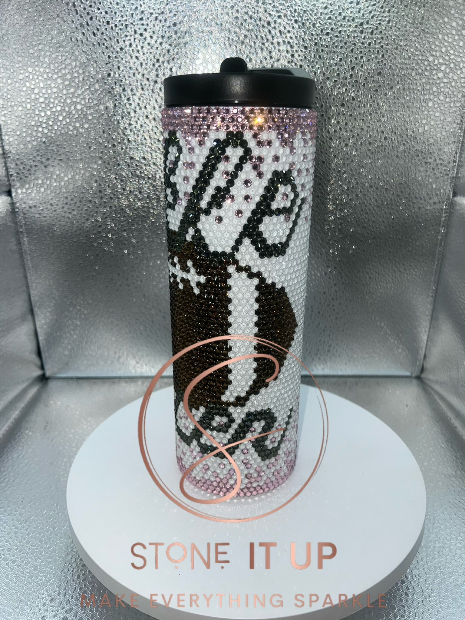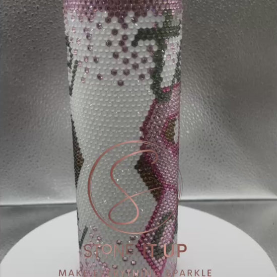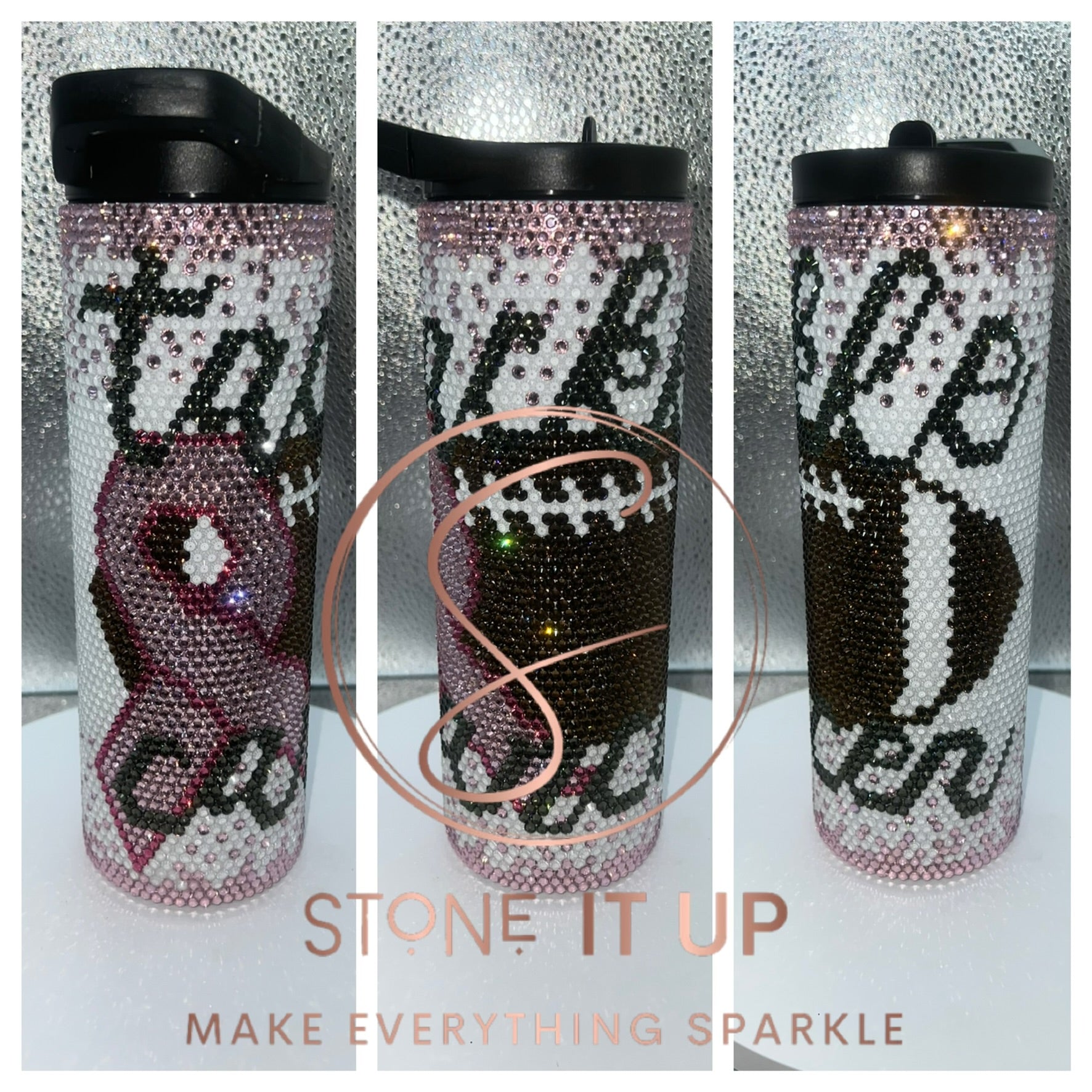 This 20oz stainless steel tumbler features a football-themed Tackle (Breast) Cancer design, adding a sophisticated touch to October's breast cancer awareness efforts. Adorned with high-quality glass rhinestones, each meticulously hand-applied using Liquid Fusion adhesive. The tumbler includes care instructions, a repair kit, and a stainless steel straw for optimal maintenance and use.