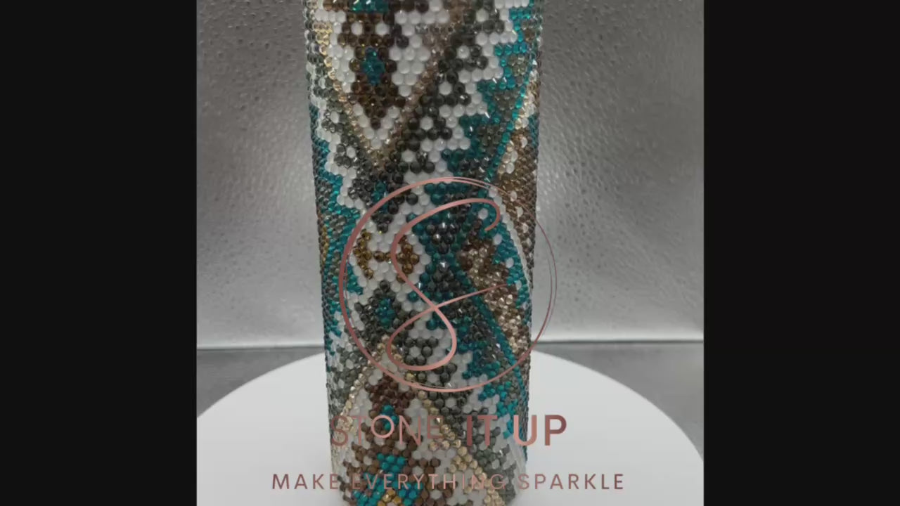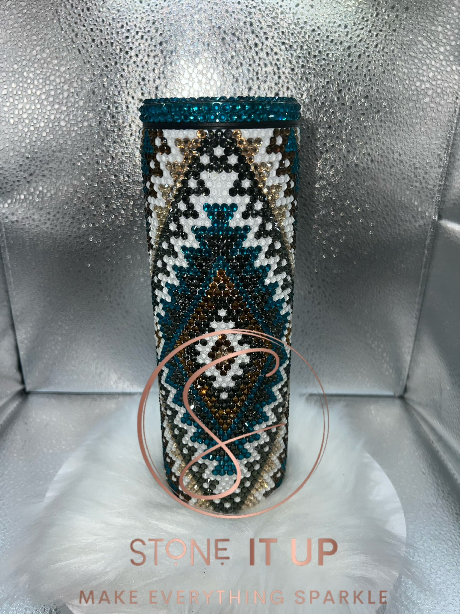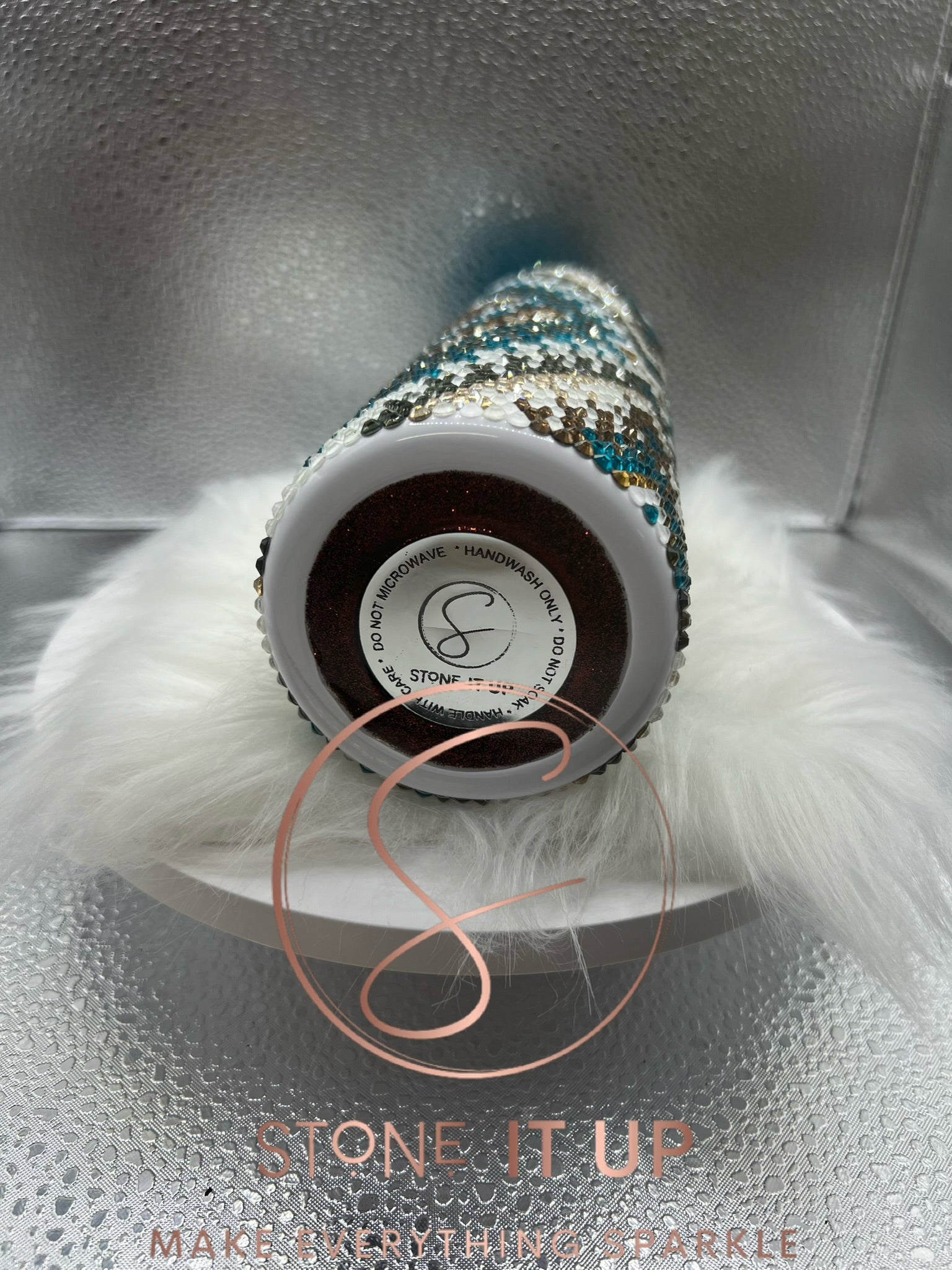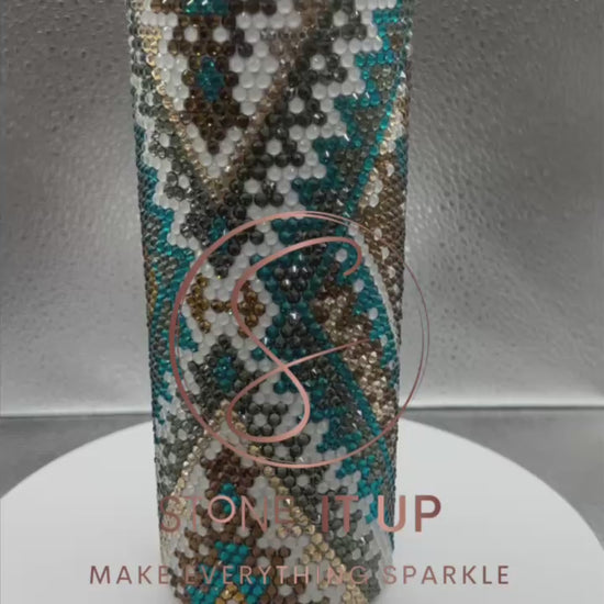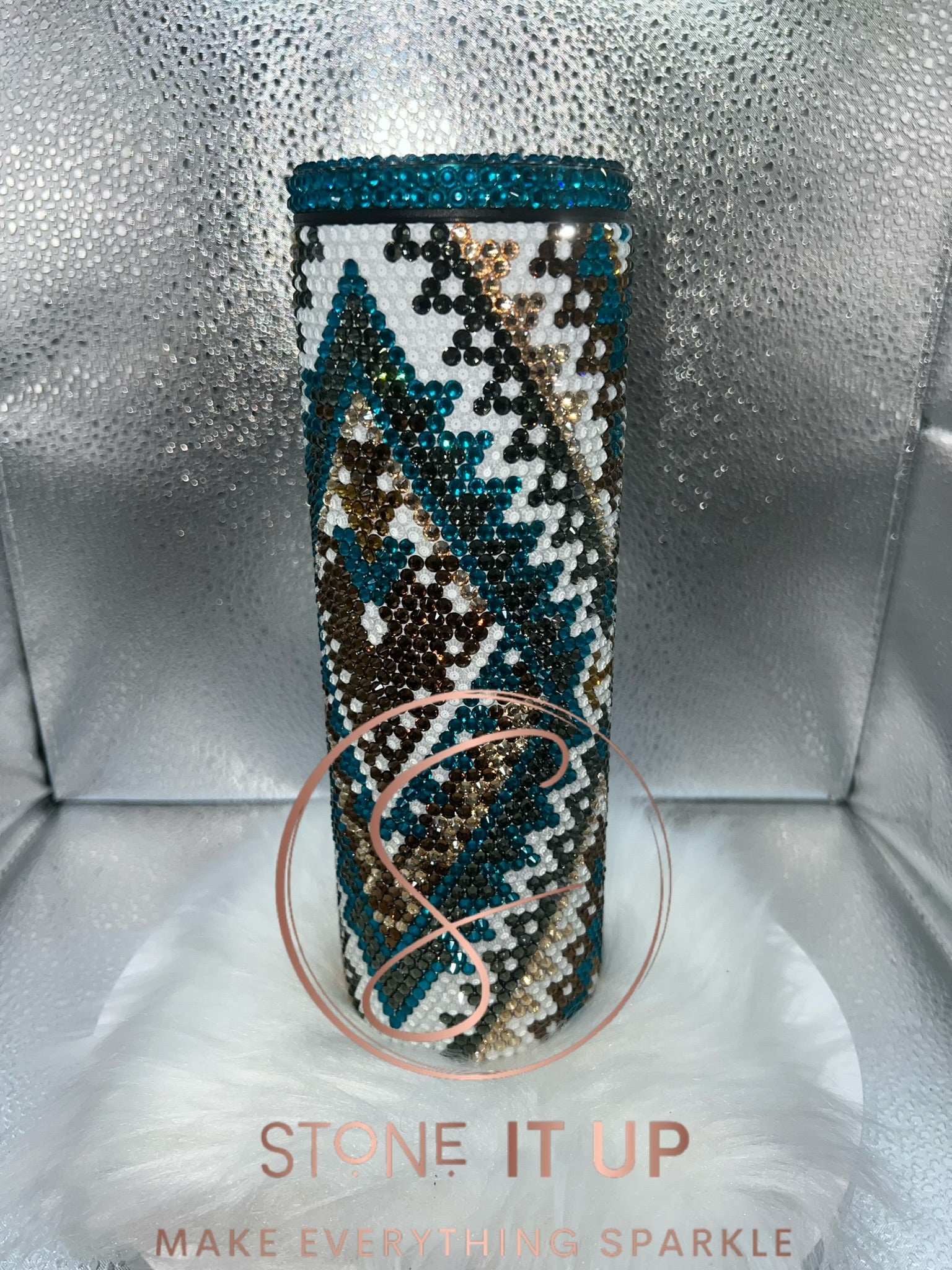 The Western Diamonds Tumbler features an intricate pattern of peacock, neon white, black diamond, topaz an smoked topaz high-quality glass rhinestones carefully hand-attached with Liquid Fusion adhesive.
