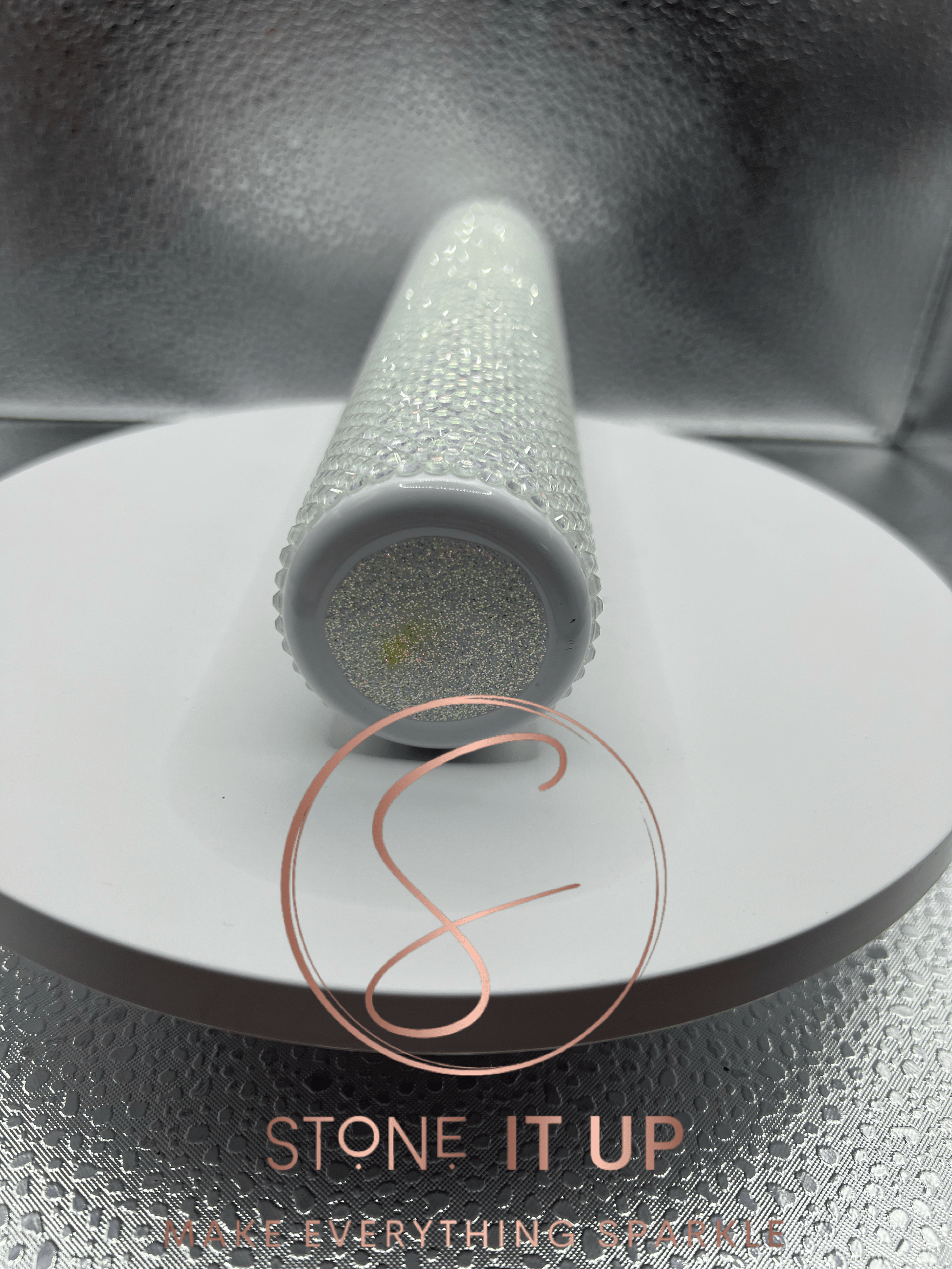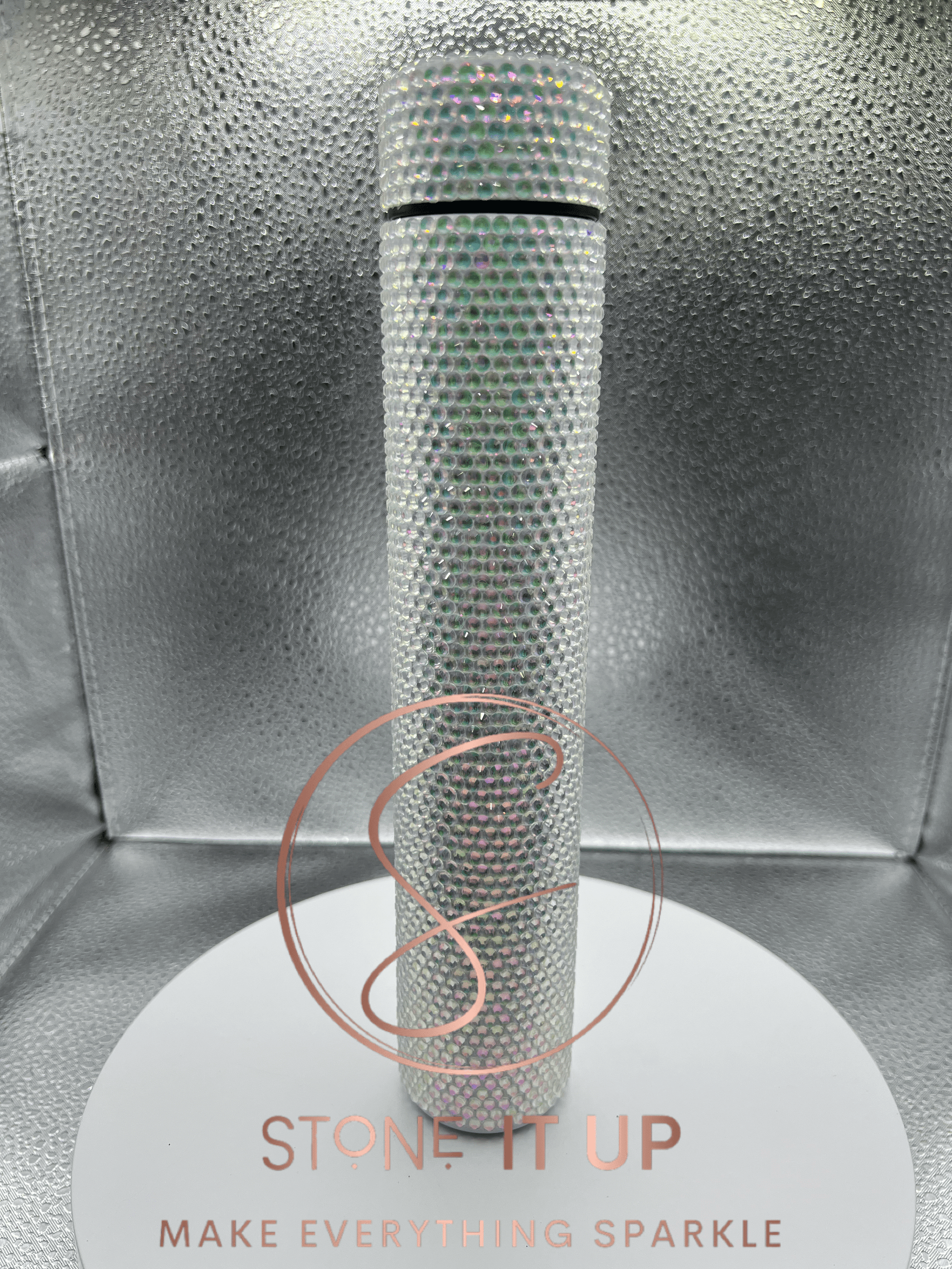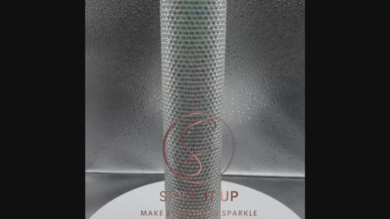 This 9oz Tall Skinny Flask Tumbler is adorned in high-quality pink and green Aurora rhinestones and hand-placed with Liquid Fusion glue to ensure durability. As a handmade item, minor imperfections may occur.