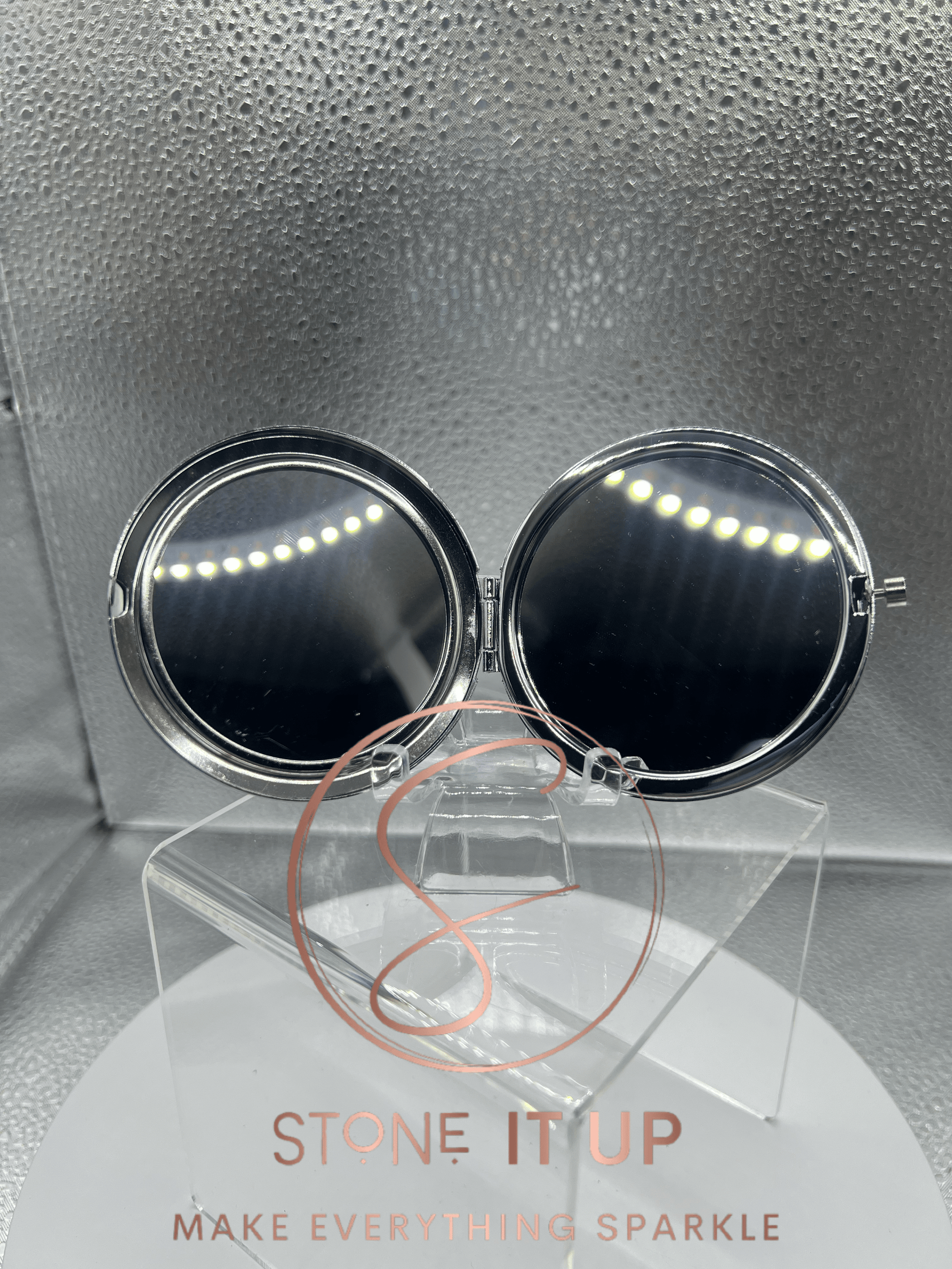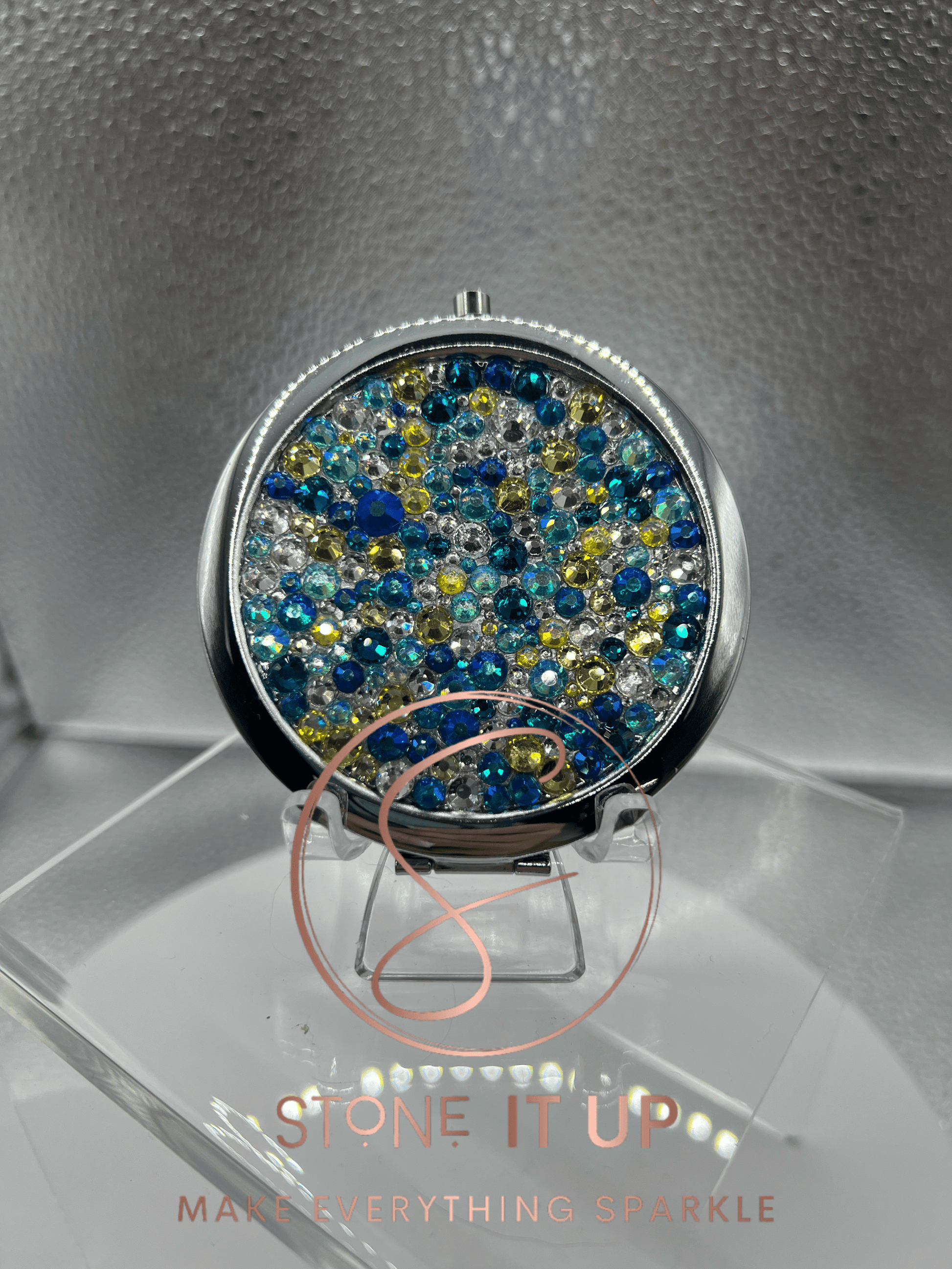 This round-shaped compact mirror features a distinctive custom blend of bling, crafted with a Birdie's Birthday Bash rhinestone mix.