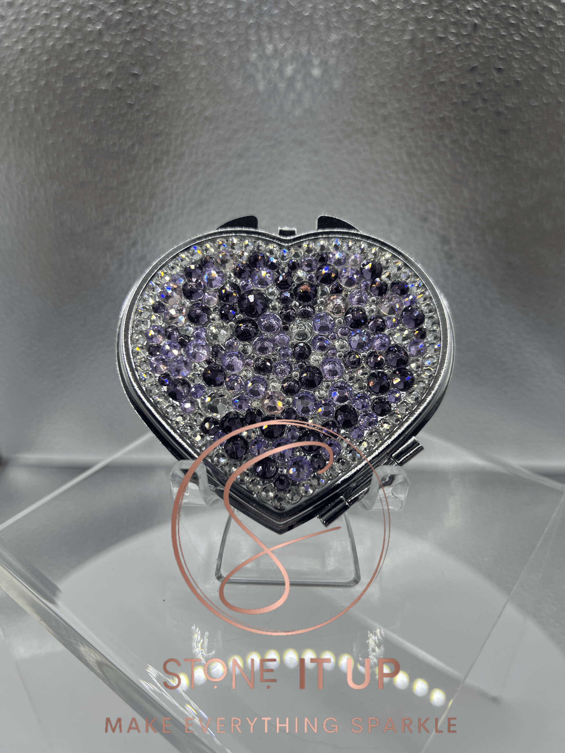 This Blinged Out Simply Sarah Heart Shaped Compact Mirror features a custom mix of sparkling stones, each carefully placed by hand using Liquid Fusion for a unique touch. Measuring at 2.75" by 2.75", this dual compact mirror includes both a regular and magnified mirror, making it a perfect and thoughtful gift option.