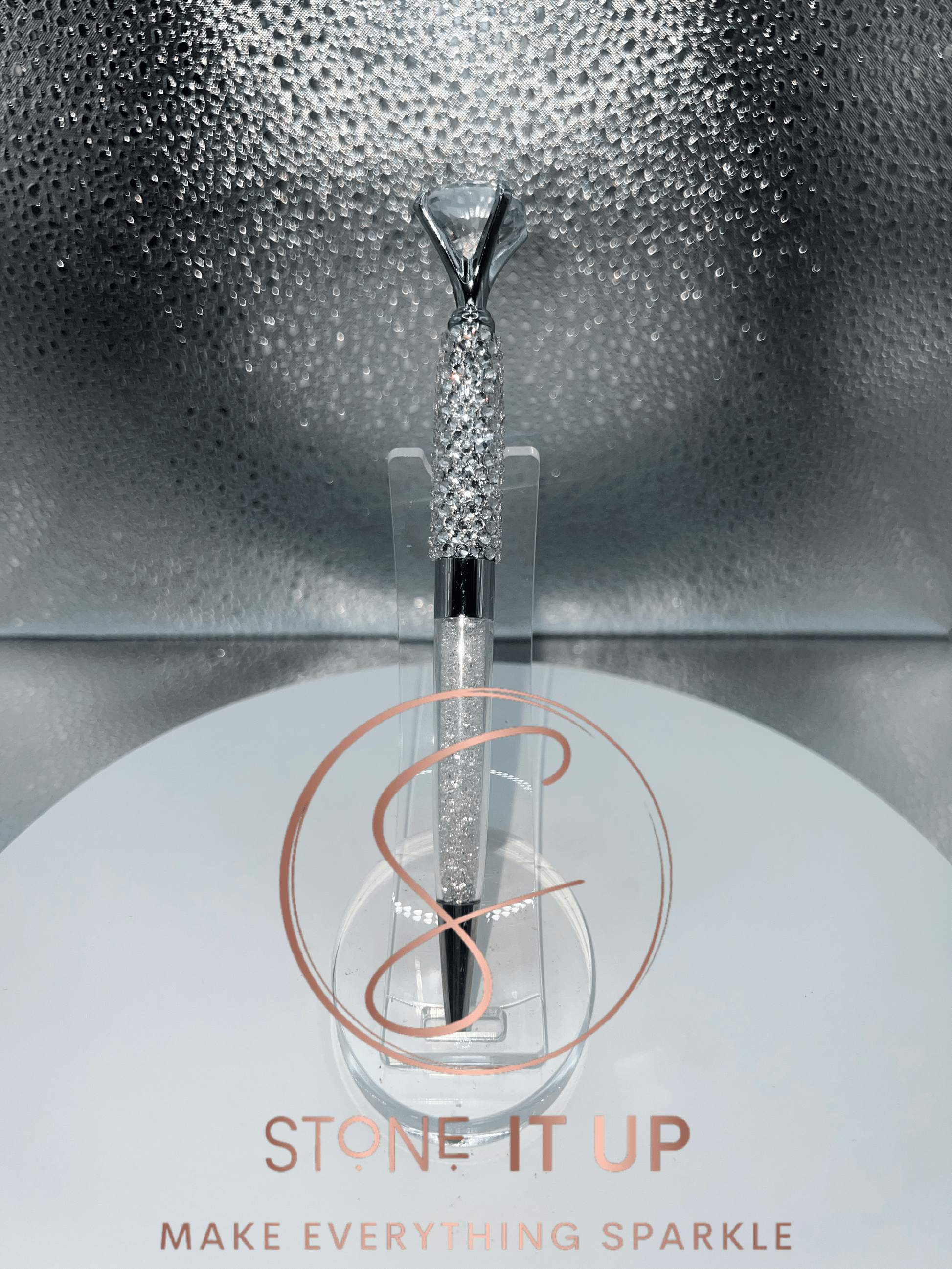This ball point pen features a full barrel bling design, adorned with dazzling Clear Crystal glass stones. These stones are carefully applied by hand using Liquid Fusion, ensuring a high-quality finish.