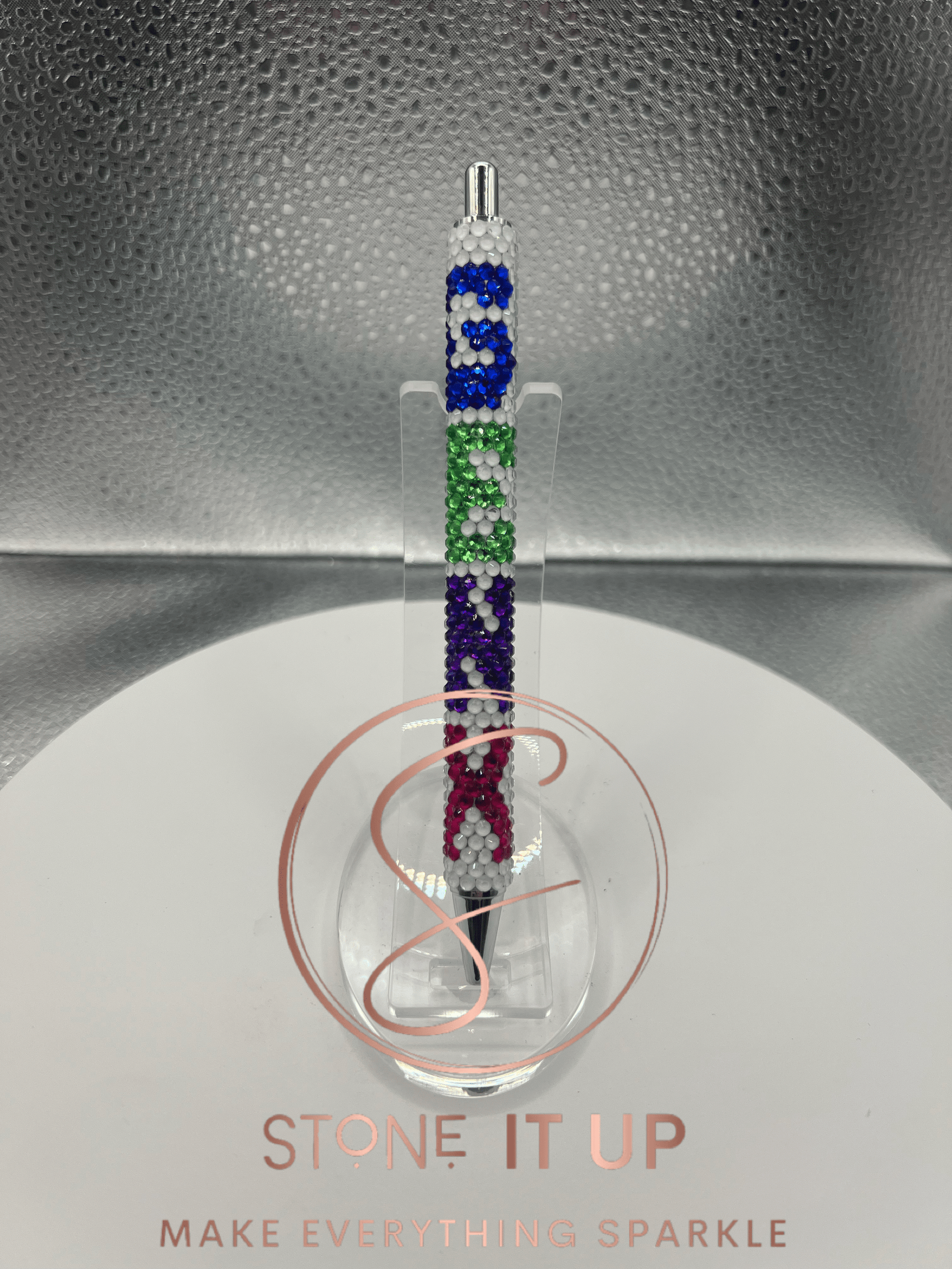 This Gen X Blinged Out Gel Pen features a unique GEN X letter design down the barrel of a stainless steel pen and comes in a vibrant color combination of cobalt, forest green, violet and bright pink.
