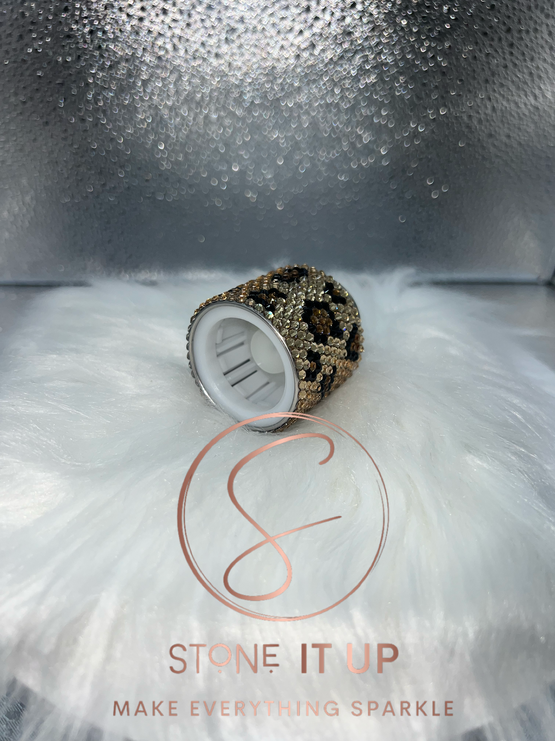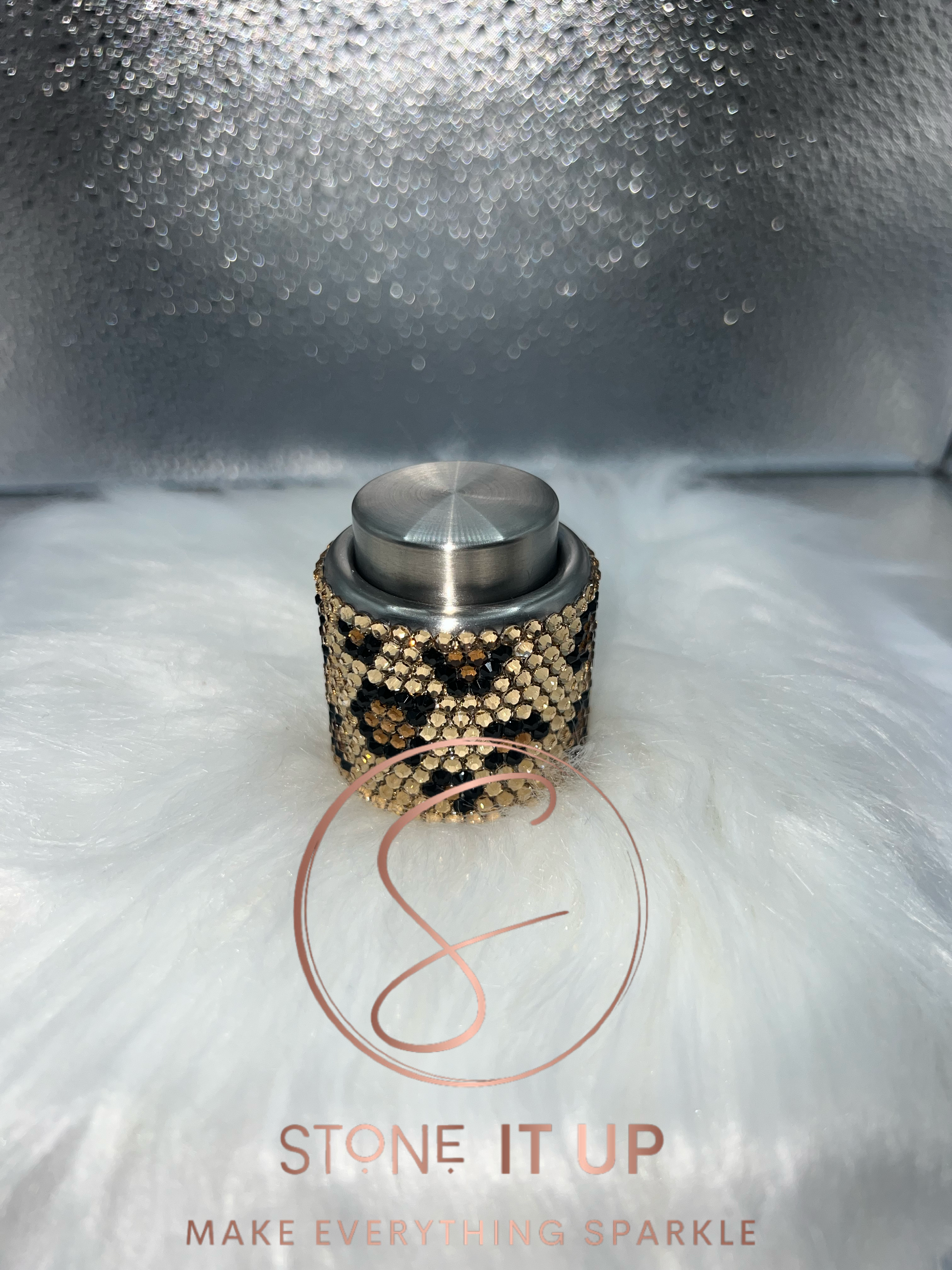 When you are left with an open bottle of wine, this stainless steel push button wine bottle topper is the perfect solution. This topper is bedazzled in a beautiful Leopard print pattern using high quality glass rhinestones and Liquid Fusion.