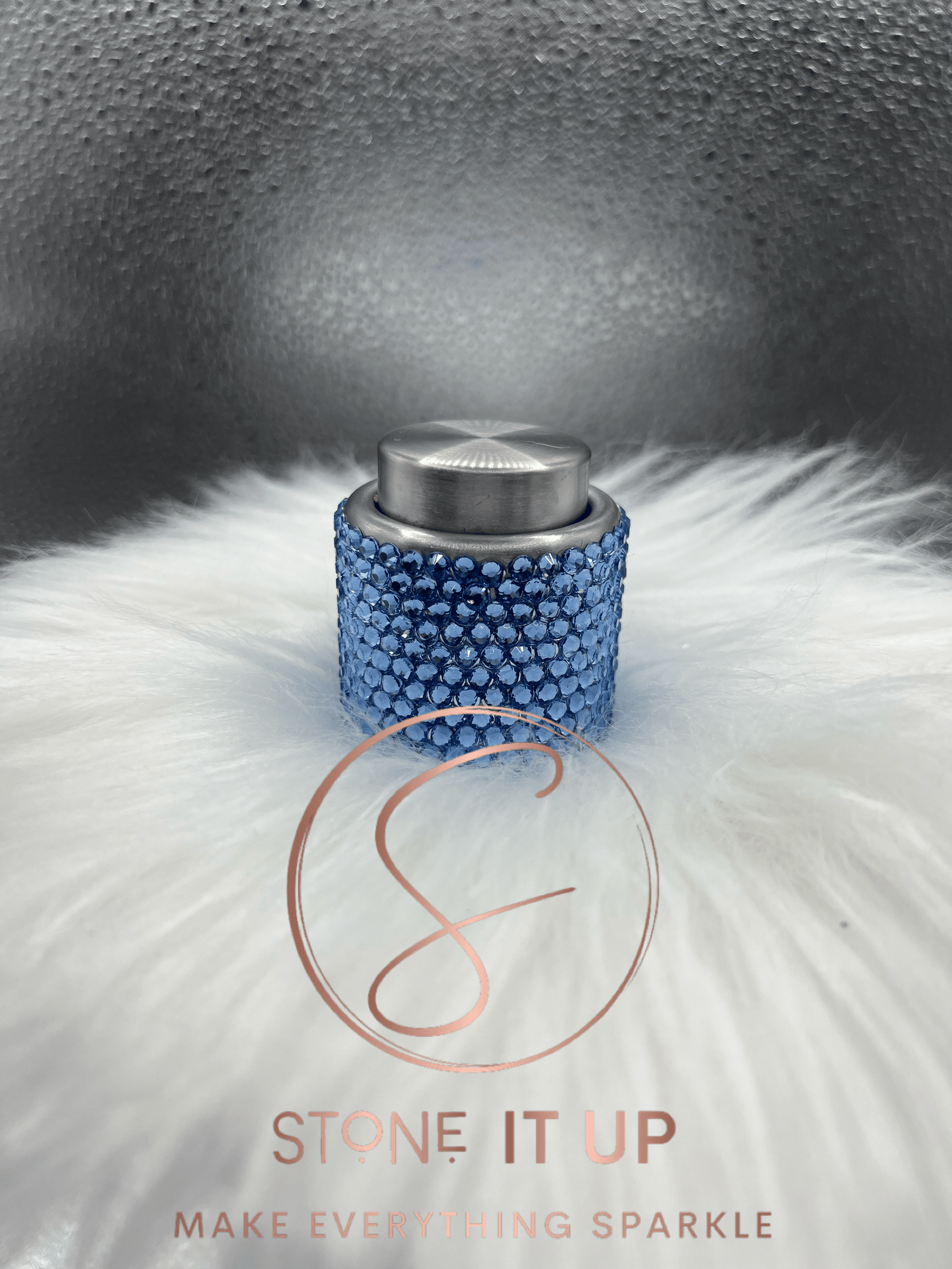 When you are left with an open bottle of wine, this stainless steel push button wine bottle topper is the perfect solution. This topper is bedazzled in a beautiful Light Sapphire color using high quality glass rhinestones and Liquid Fusion.