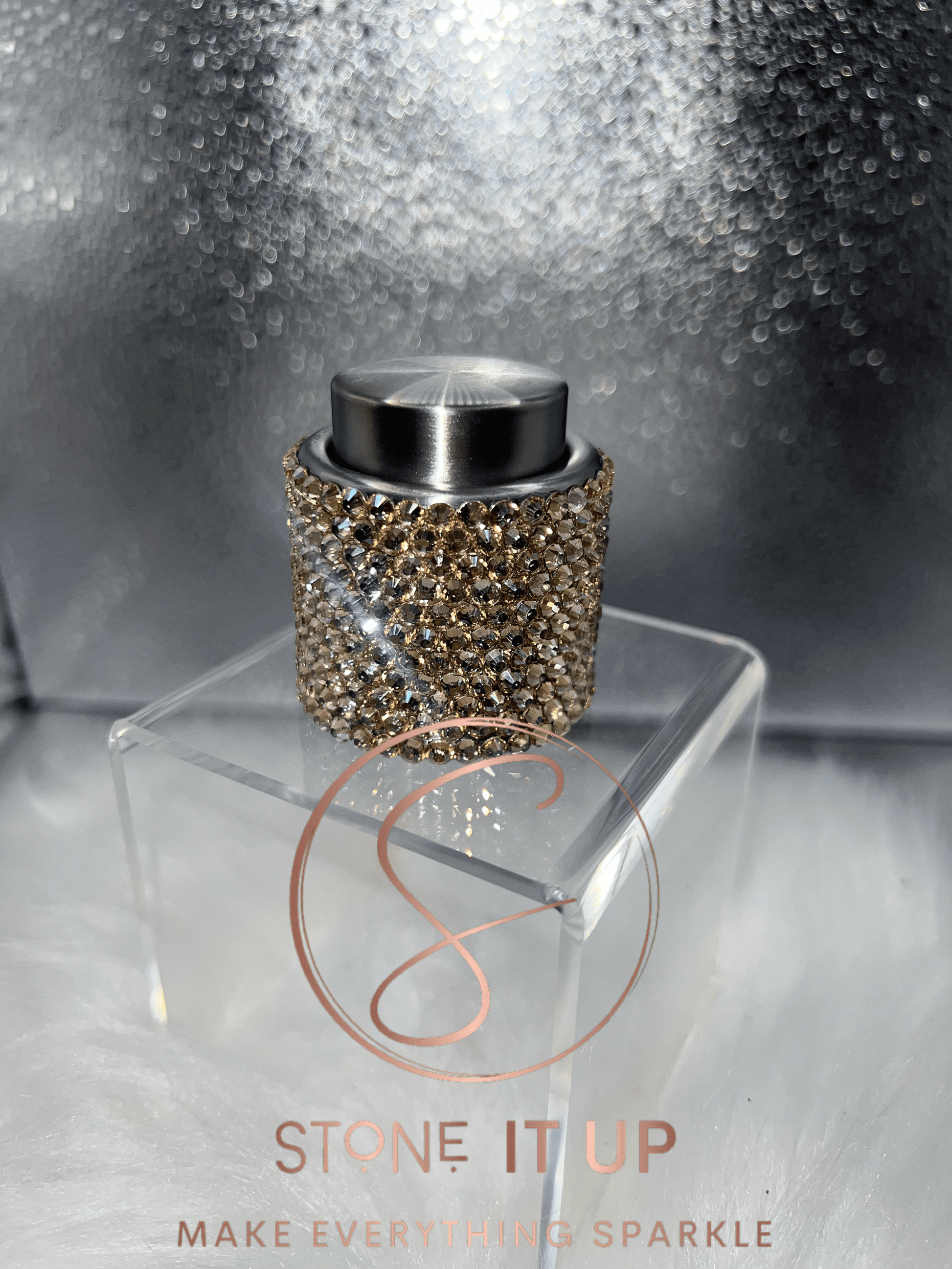 When you are left with an open bottle of wine, this stainless steel push button wine bottle topper is the perfect solution. This topper is bedazzled in a beautiful Golden Shadow color theme using high quality glass rhinestones and Liquid Fusion.
