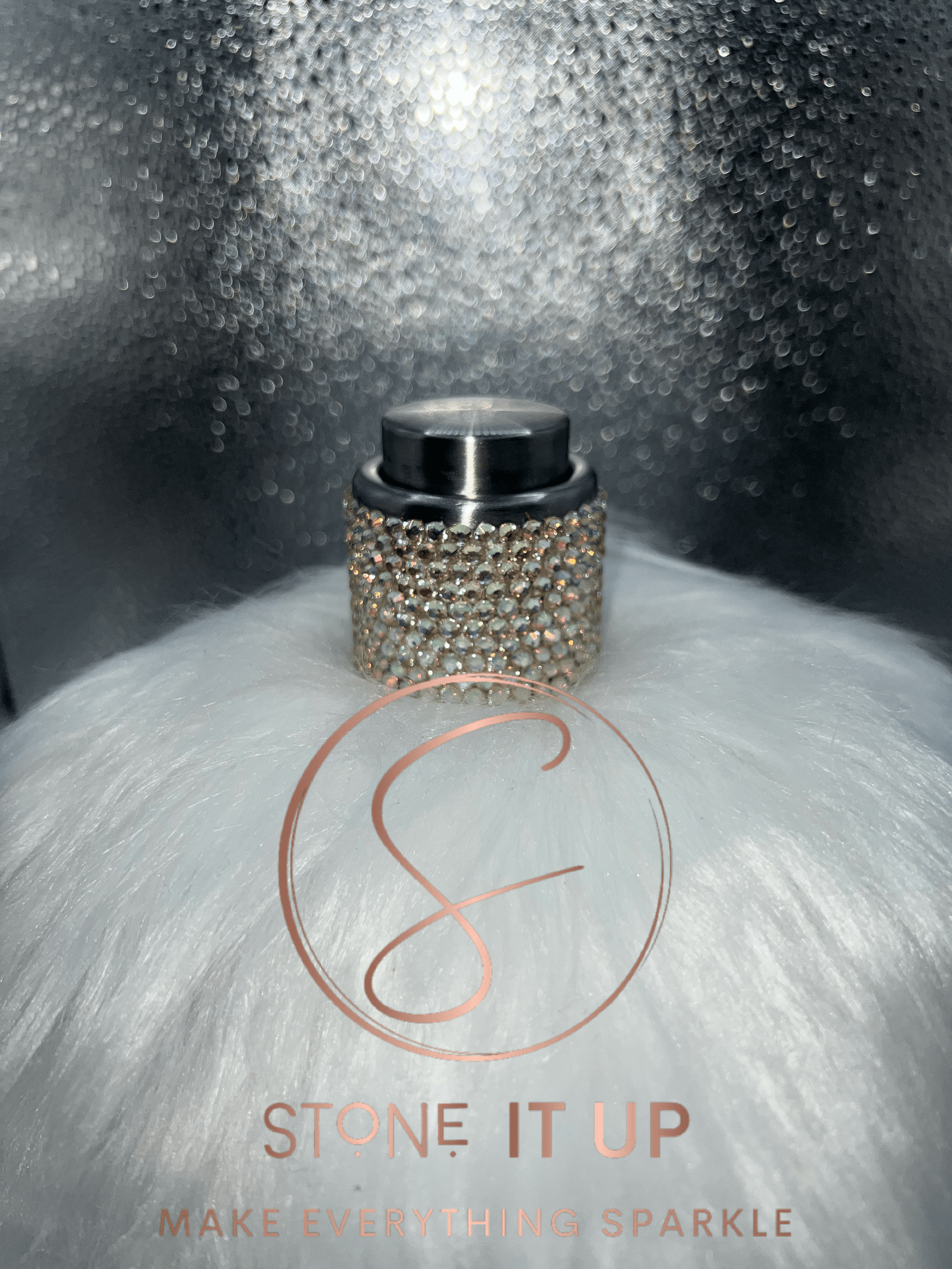 When you are left with an open bottle of wine, this stainless steel push button wine bottle topper is the perfect solution. This topper is bedazzled in a beautiful Mirage Crystal color using high quality glass rhinestones and Liquid Fusion.